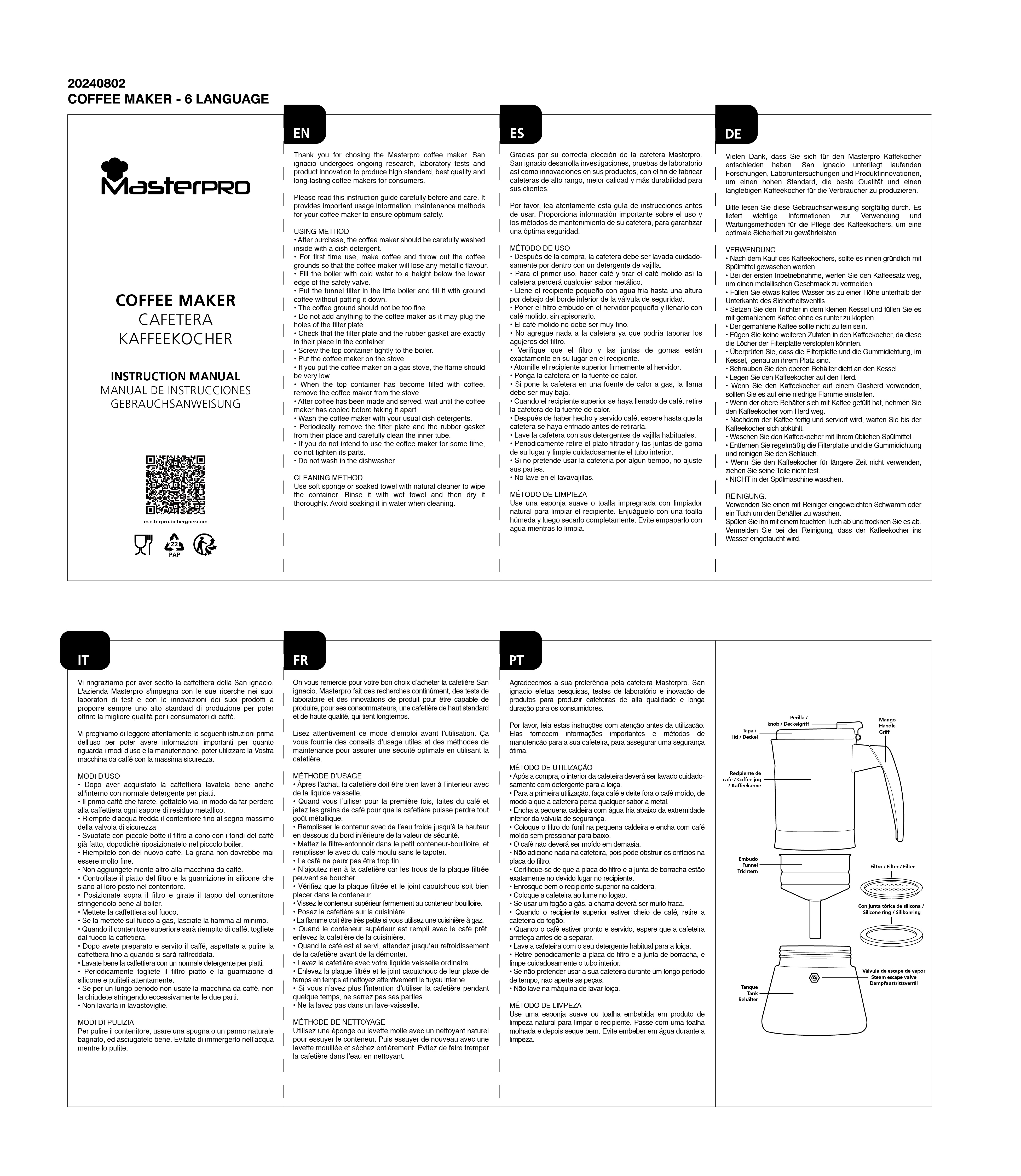 Cafetera para 6 tazas fabricada con acero inoxidable de alta calidad resistente a la corrosión, ofrece durabilidad y rendimiento profesional. Apta para inducción.
